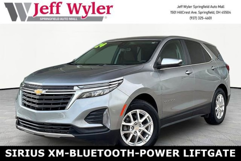 Jeff Wyler Springfield Auto Mall is proud to offer this good-looking 2024 Chevrolet Equinox LT in Sterling Gray Metallic. Well equipped with: Preferred Equipment Group 1LT, 17 Aluminum Wheels, 2 Rear USB Charging-Only Ports, 2 USB Ports & Auxiliary Input Jack, 2-Way Power Driver Lumbar Control Seat Adjuster, 3.50 Final Drive Axle Ratio, 4-Wheel Disc Brakes, 6 Speakers, 6-Speaker Audio System Feature, ABS brakes, Air Conditioning, Alloy wheels, AM/FM radio: SiriusXM, Auto High-beam Headlights, Automatic temperature control, Bluetooth® For Phone, Brake assist, Bumpers: body-color, Compass, Delay-off headlights, Driver 8-Way Power Seat Adjuster, Driver door bin, Driver vanity mirror, Dual front impact airbags, Dual front side impact airbags, Electronic Stability Control, Emergency communication system: OnStar and Chevrolet connected services capable, Four wheel independent suspension, Front anti-roll bar, Front Bucket Seats, Front Center Armrest, Front dual zone A/C, Front Passenger 4-Way Manual Seat Adjuster, Front reading lights, Fully automatic headlights, Heated door mirrors, Heated Driver & Front Passenger Seats, Heated front seats, Illuminated entry, Low tire pressure warning, Occupant sensing airbag, Outside temperature display, Overhead airbag, Overhead console, Panic alarm, Passenger door bin, Passenger vanity mirror, Power door mirrors, Power driver seat, Power Liftgate, Power steering, Power windows, Premium audio system: Chevrolet Infotainment 3, Premium Cloth Seat Trim, Radio data system, Radio: Chevrolet Infotainment 3 System w/AM/FM, Rear anti-roll bar, Rear reading lights, Rear seat center armrest, Rear window defroster, Rear window wiper, Remote keyless entry, Security system, SiriusXM, Speed control, Speed-sensing steering, Split folding rear seat, Spoiler, Steering wheel mounted audio controls, Tachometer, Telescoping steering wheel, Tilt steering wheel, Traction control, Trip computer, and Variably intermittent wipers. Ask about available certifications. Used vehicles 10 years of age or newer with less than 100,000 miles are eligible for the Wyler Assurance Program, but eligible vehicles must pass our reconditioning process and multi-point inspection. Provided the vehicle passes inspection, vehicles will be eligible for the 6 month/6,000 mile limited warranty. The 6 month/6,000 mile limited warranty is NOT available on AS-IS vehicles, wholesale vehicles, lease buyback/pass-thru vehicles or un-inspected vehicles. Note that this program can also apply to vehicles where the remaining factory coverage is less than 6 months or 6,000 miles. Please check the Federal Trade Commission (FTC) Buyers guide on the vehicle for full details as to whether or not warranty coverage may apply. Contact Dealer for additional details. The Wyler Assurance 6 month/6,000 Mile limited warranty ends 6 months from the date of the Retail Purchase Agreement (BUYERS ORDER) or when the vehicle's odometer registers 6,000 additional miles to the mileage listed on the BUYERS ORDER, whichever comes first. Your Deductible - The warranty holder on your contract pays the first $100 of each covered repair.